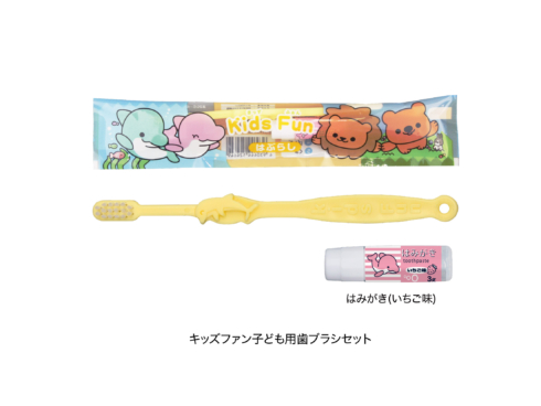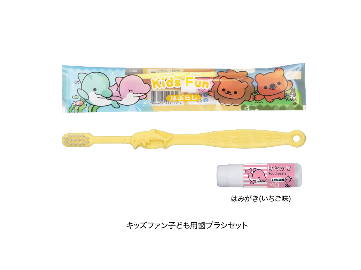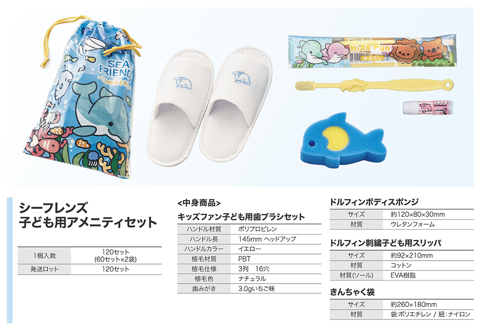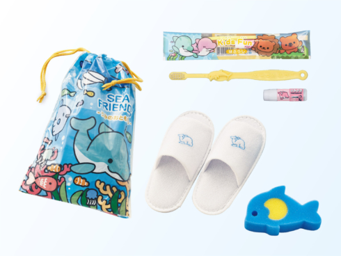 セットである「歯ブラシセット、スリッパ、ボディスポンジ、巾着」のそれぞれに海の生き物たちがデザインされており、お子様の楽しめるよう工夫されています。